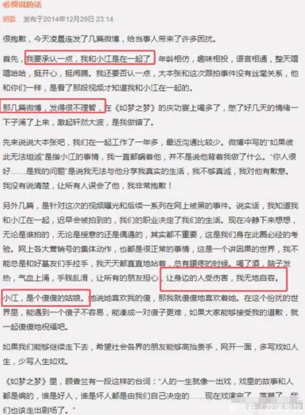 次年,有媒体拍到两人在机场拥吻,消息刚发酵,胡歌深夜连发几条微博。